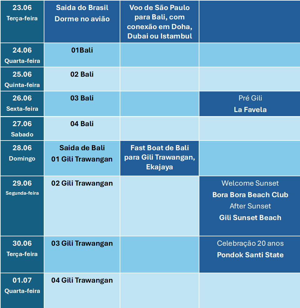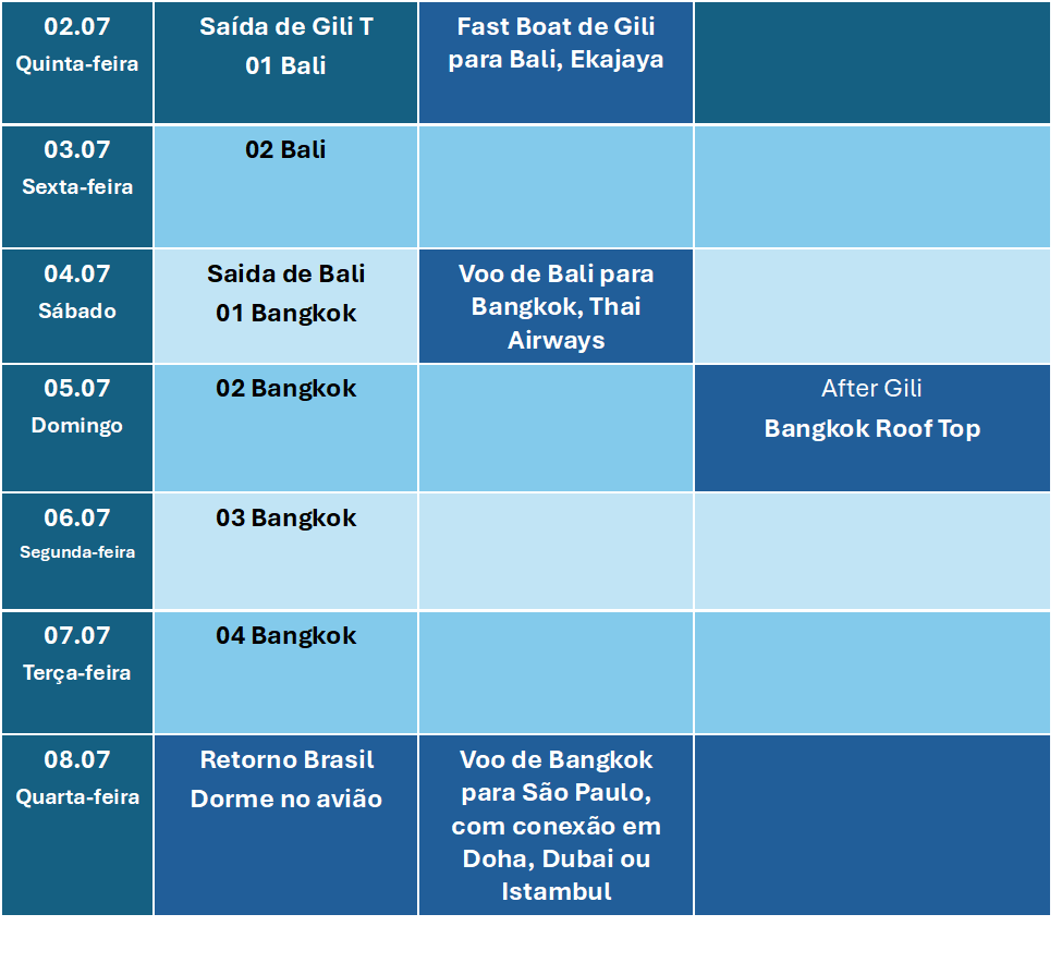 Partindo do Brasil em 23 de Junho, terça-feira, de São Paulo (GRU) para Bali (DPS), com conexão em Doha, Dubai ou Istambul, e retornando em 8 de Julho, quarta-feira, de Bangkok (BKK) para São Paulo (GRU), também com conexão.