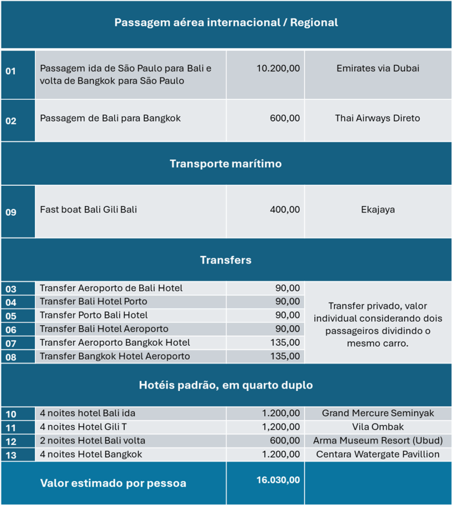 No roteiro abaixo, sugerimos hotéis padrão com boa localização. No entanto, tanto Bali quanto Gili e Bangkok oferecem uma ampla variedade de opções de hospedagem para todos os estilos e orçamentos. Recomendamos explorar também outras alternativas na região certamente você encontrará aquela que melhor se adapta às suas preferências.